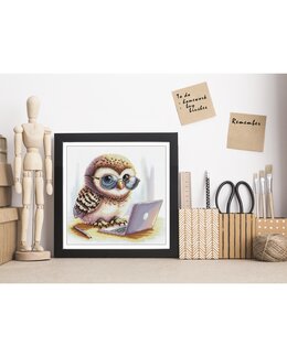 Diese bezaubernde kleine Eule mit Brille sitzt an ihrem Laptop, bereit für die Arbeit des Tages oder vielleicht ein virtuelles Meeting.
