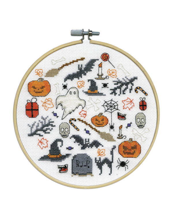 Charmantes Kreuzstich-Stickbild mit Halloween-Symbolen in einer verspielten Collage. Das Motiv zeigt Kürbisse, ein Gespenst, Fledermäuse, eine schwarze Katze, einen Hexenhut, Spinnweben, einen Totenkopf und Herbstblätter.