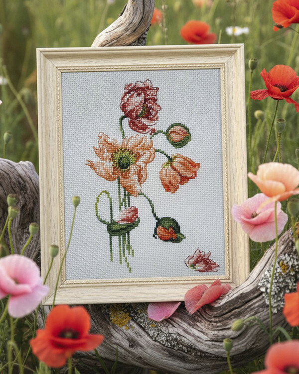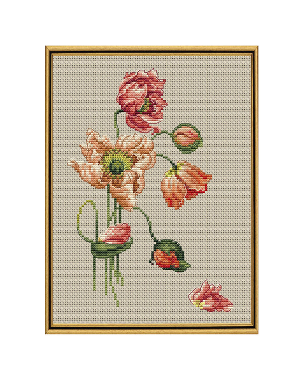 Ein romantisches Blumenmotiv in warmen Apricot- und Koralltönen. Die sanften Farben ergeben ein harmonisches, stilvolles Stickbild, das sich wunderbar als Deko-Detail eignet.