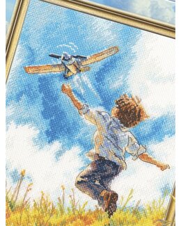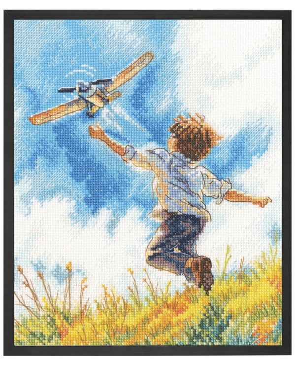 Erlebe die Freiheit mit dieser inspirierenden Stickpackung!Ein Junge läuft durch die Farben einer Sommerwiese, während d...