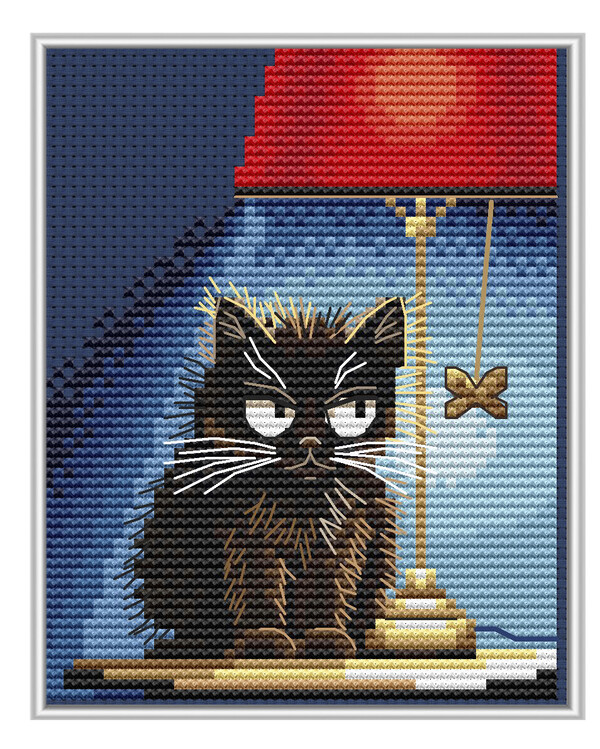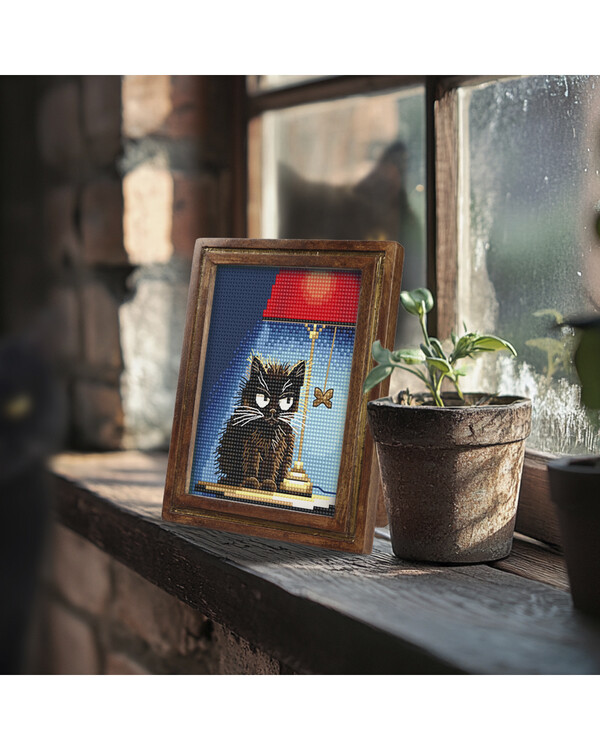Eine frech-grimmige Katze sitzt im Schein einer roten Lampe – ein Motiv voller Humor und Persönlichkeit! Macht richtig Spaß zu sticken und man schließt es sofort ins Herz!