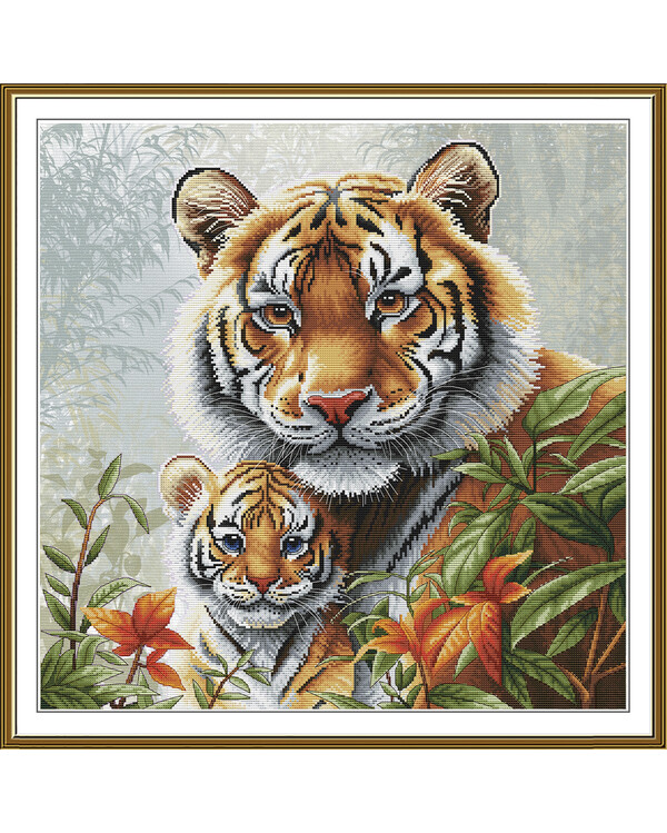Eine elegante Stickpackung mit Tiger-Motiv – eine wunderschöne Tigerin mit ihrem Jungen in den warmen Farben der Natur. Das Stickbild fängt sowohl Stärke als auch Zärtlichkeit ein und wird, wenn es fertig ist, zu einem fantastischen Bild.