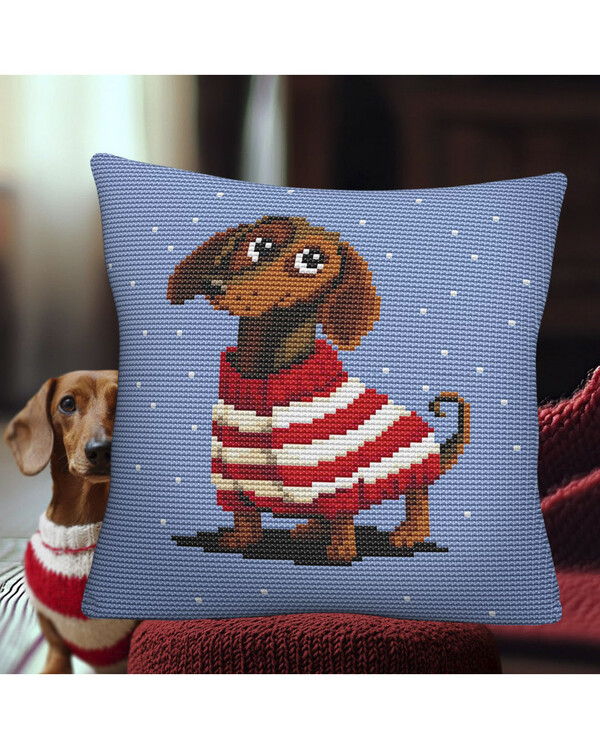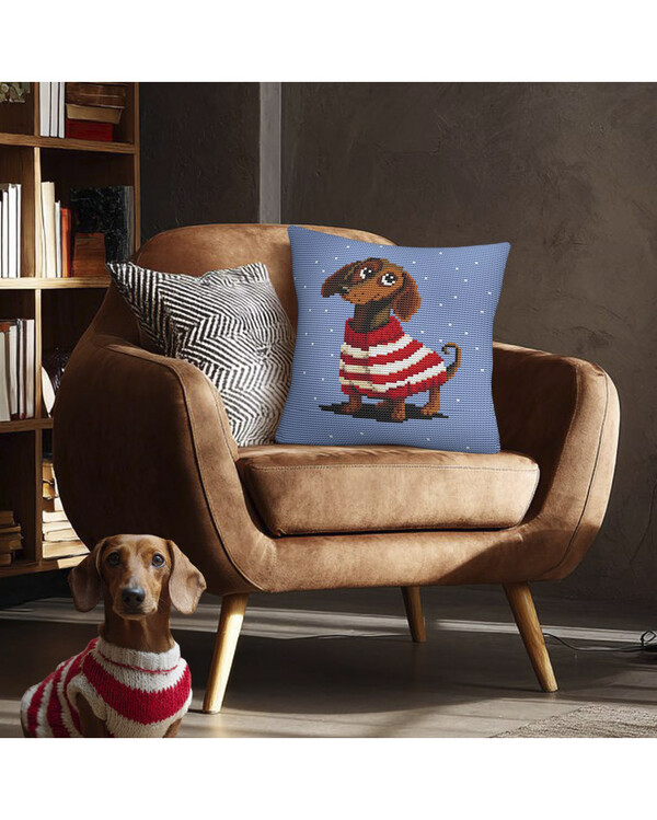 Ein wunderschönes Kissen mit einem verspielten Motiv: ein Dackel im rot-weißen Pullover. Das fröhliche Design sorgt für eine warme und humorvolle Atmosphäre – perfekt fürs Kinderzimmer, Wohnzimmer oder als persönliches Geschenk.