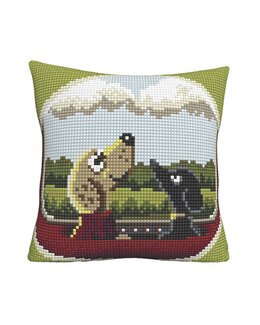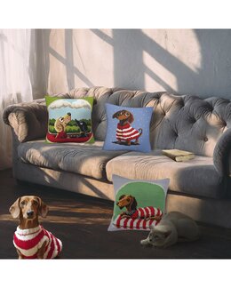 Lass dieses charmante Kissen mit zwei fröhlichen Dackeln auf einem Autoausflug zu einem farbenfrohen Highlight in deinem Zuhause werden.