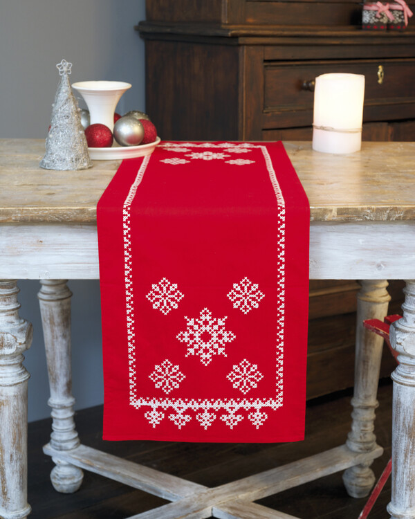 Kreiere den schönsten Blickfang der Weihnachtszeit mit dieser eleganten Stickpackung! Dieser Tischläufer mit klassischen Weihnachtssternen sorgt für eine gemütliche und stimmungsvolle Atmosphäre auf deinem Weihnachtstisch.